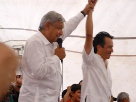 Amlo alzando el brazo del diputado Cuitláhuac |