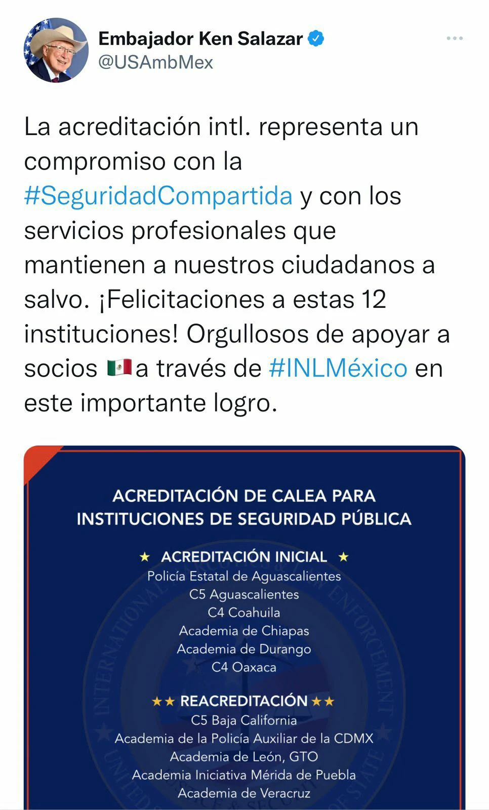 Xalapa, Ver. 27 de julio de 2022. Luego de que el Embajador de Estados Unidos en México, Ken Salazar, felicitara vía sus redes sociales oficiales al Centro de Estudios e Investigación en Seguridad (CEIS) por haber obtenido la reacreditación por parte de la Comisión de Acreditación para Agencias de Aplicación de la Ley (CALEA), el secretario de Seguridad Pública, Hugo Gutiérrez Maldonado, expresó su agradecimiento y a su vez, felicitó a las otras 11 instituciones de seguridad del país que lograron acreditar altos estándares de calidad en el servicio policial.